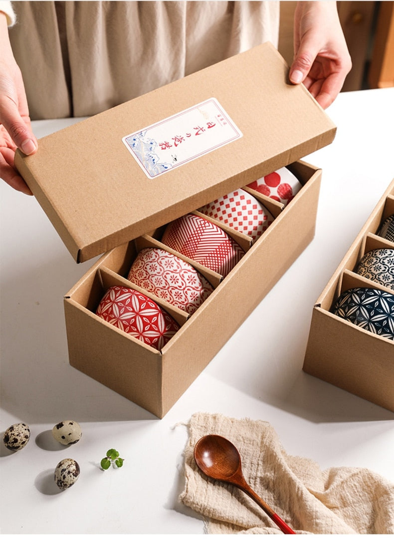 Elegant Floral Ceramic Bowl Set – Japanese & Korean Style Tableware with Gift Box (5-Piece, Blue or Red)